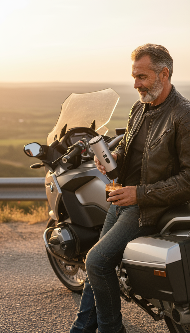 Chauffe ≈ 5 min, 3–5 cafés/charge, USB-C pour recharger sur la moto.